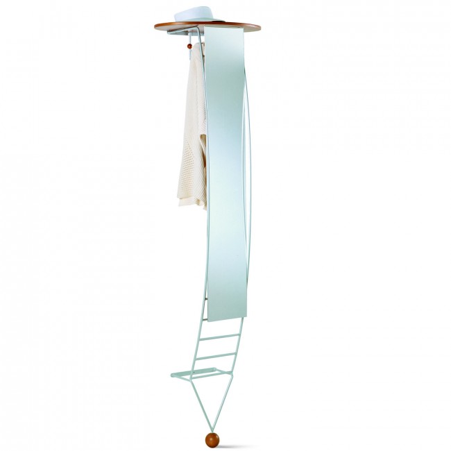 Lo specchio si aggancia a parete ma è dotato di un originale appoggio a terra a forma di sfera, abbinabile per finitura alla mensola.