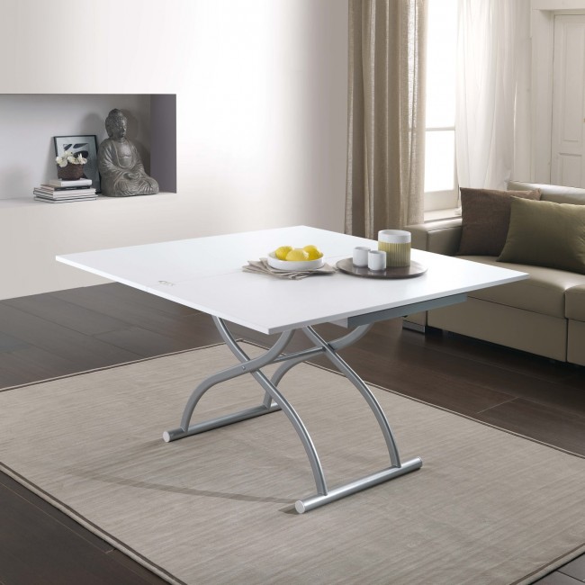 quadrato. Da chiuso è un basso e rettangolare tavolino da salotto ideale nella zona fronte divano, un appoggio per quei piccoli oggetti che si vogliono avere sempre a portata di mano durante un momento di relax. All'occorrenza può essere trasformato in tavolo da pranzo: la struttura viene alzata fino a raggiungere l'altezza adatta per affiancare comodamente le sedie mentre il piano viene ruotato e aperto così da raddoppiarne le dimensioni.