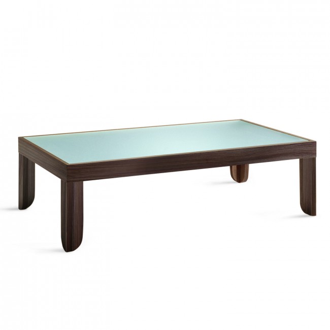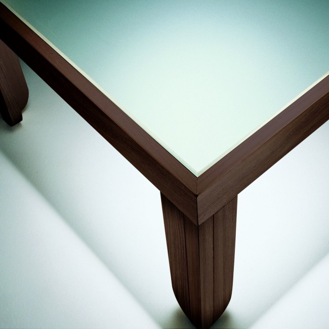 acidato, disponibile anche nel modello rettangolare. All'apparente semplicità si abbina un'estrema cura per i dettagli: il piano è infossato all'interno e all'altezza della struttura; le gambe sono leggermente arrotondate nella parte inferiore dove toccano terra.