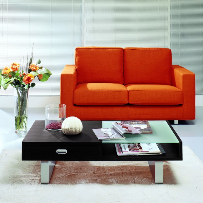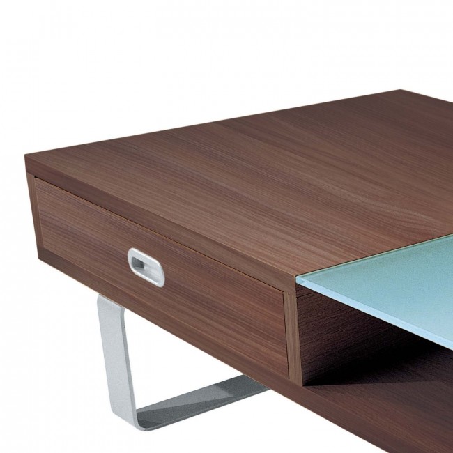 portaoggetti apribile da entrambi i lati e vano portariviste. È realizzato unendo sapientemente tre materiali molto diversi tra loro: legno rivestito per struttura e una parte del piano, cristallo acidato per l'altra metà del piano, metallo per le due gambe.