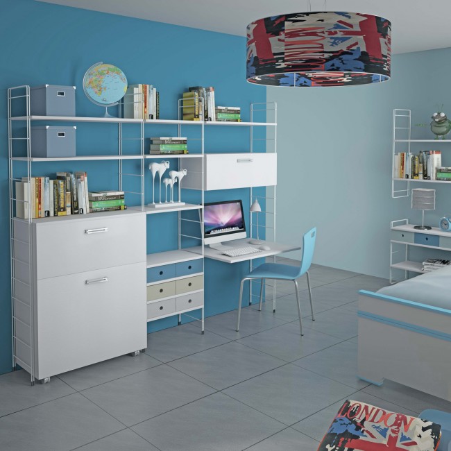 scrivania integrata, contenitori e cassetti. La collezione Link offre un sistema libreria modulare con struttura a montanti in metallo, ripiani ed una serie di utili accessori collocabili a piacere. Tra i vari optional i più utili all'arredo di una cameretta sono lo scrittoio, la scrivania a penisola e i cassetti colorati con cui è possibile realizzare cassettiere da posizionare a fianco della scrivania, ma anche comodini sospesi a parete o in appoggio a terra.